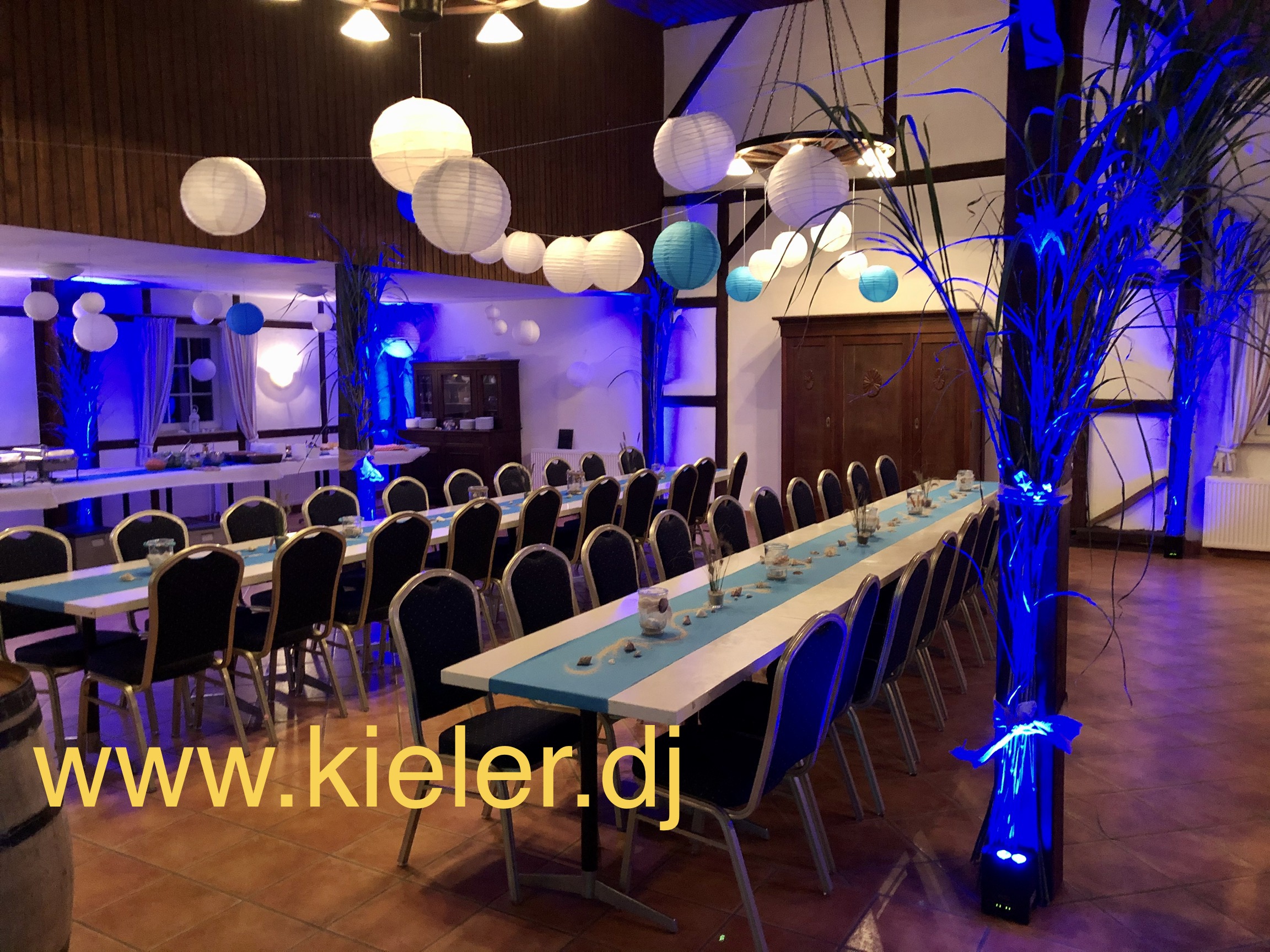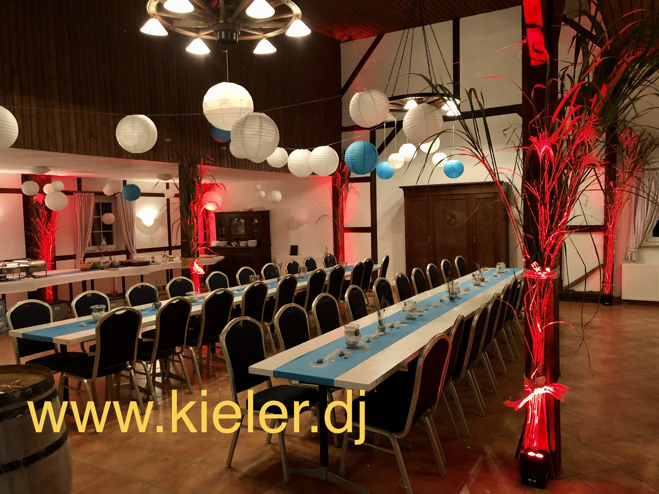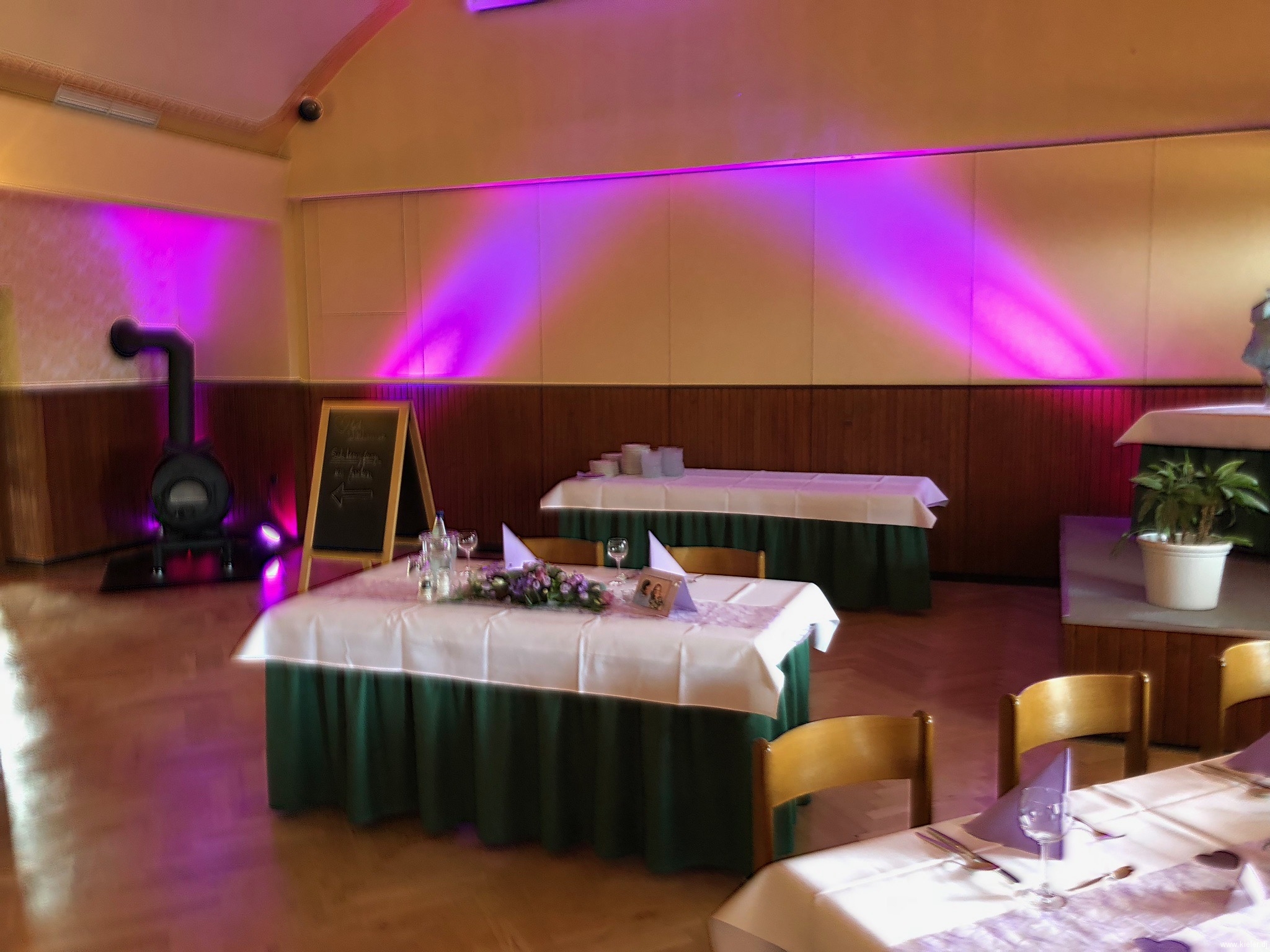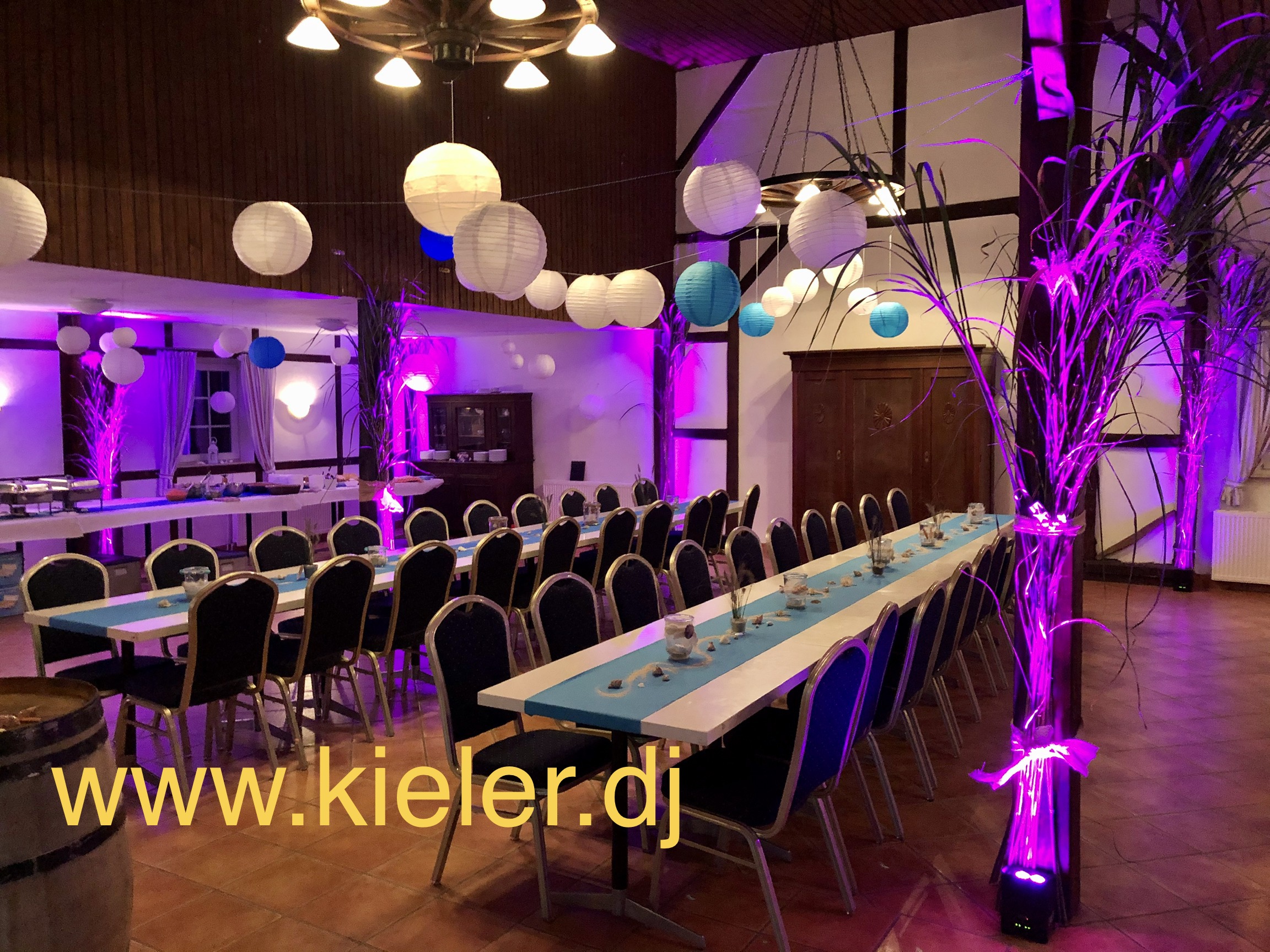 Die Tische sind exquisit gedeckt. Ein echter Hingucker. Die Stühle sind edel verhüllt mit schneeweißen Stuhlhussen und einer bezaubernden Schleife passend zur Tischfarbe. Es sieht so einladend, so stilvoll aus. Der DJ hat seine Anlage professionell aufgebaut. Da hängen keine Kabel herum oder bilden Stolperfallen auf dem Boden. Discolicht erstrahlt auf der Tanzfläche… für später…!